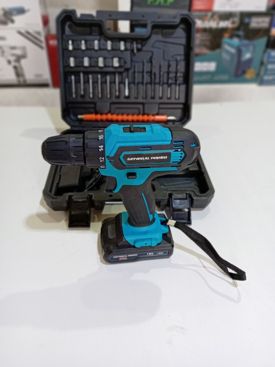 دریل شارژی 18ولت جنرال پاور دارای2عدد باطری 5سلول کتابی لیتیومی شارژر فست شارژ جعبه bmc ترکمتر 18حالته لوازم همراه چند عدد مته و بکس و رابط فنری کیفیت عالی